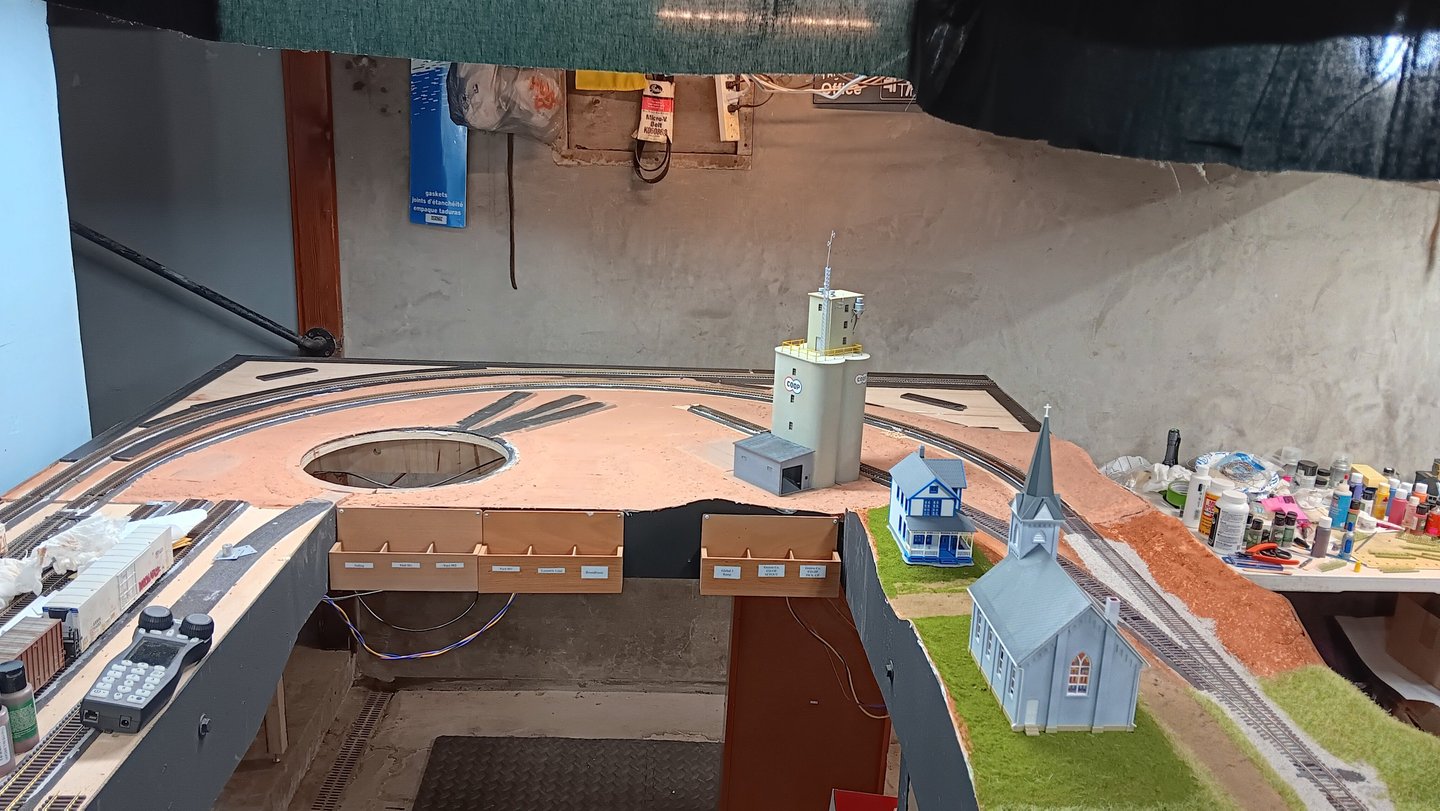 My kids like to do crafty things, and I try to find projects they can help with on the layout. Since the Greene River scene was far enough along, I moved on to the section that includes the turntable, grain elevator, and intermodal yard. We got messy and mixed up some Sculptamold. It got spread out to create landforms and left to dry. That was a couple of weeks ago. Then life got kind of busy with a family emergency. Tonight was the first night I was able to get to the basement in a while. So before the kids got into bed, they took turns coming down stairs to help paint the brown base coat.