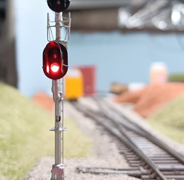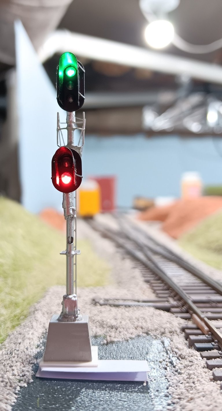 Finally, with the main part of the scenery in place on the Greene River area, I temporarily installed the signals around one of the future CTC control points. Around the whole layout, I am using a variety of signal brands and styles. I just like signals, and thought that would be the best way to show off the different types. For this control point, I'll use the Details West Type D pre made signals. They are pricey, but dang they are nice! I have them wired to Digitrax TSMK boards. Then a 10-pin ribbon cable runs back to the SE8c signal driver board. These driver outputs are controlled with switch commands. So I was able to test all the aspects of the 3 signals in place so far. Once I get a few more signals wired in, I'll connect my laptop running JMRI and program the signals to operate in ABS mode for now. Adding logic to make them CTC just builds on the automatic operation that comes first.