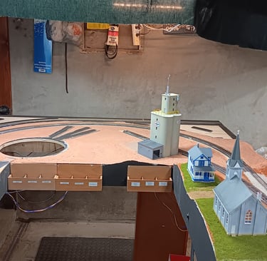 My wife helped me cut strips of black fabric 9 feet long and 10 inches wide. I wanted a valence to block the light from a viewer looking at the layout from inside the pit. But the old farmhouse basement doesn't have a lot of head room. I figured if I used something hard I would end up hitting my head. So I ran a string around the ceiling, and used clothes pins to hang the black fabric.