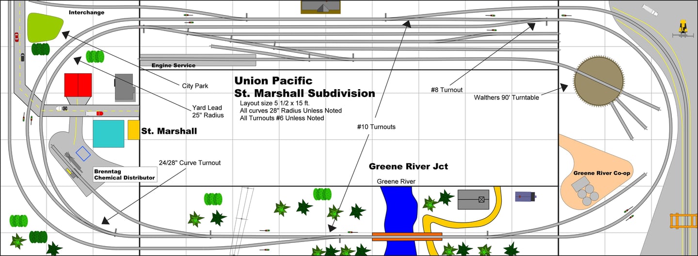 The layout track plan includes a continuous single track mainline (approx. 33 feet long), a single stub-ended visible staging track, a passing siding that doubles as a yard lead, a 3-track stub-ended yard, turntable, engine service track, Shoving Platform (a.k.a. caboose) track, 2 local industries, a track representing an interchange to a shortline railroad, and an intermodal yard.