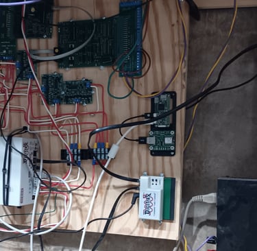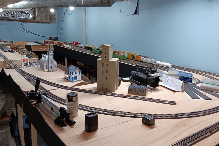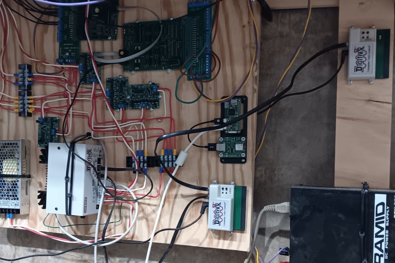 The layout is 5 1/2 x 15 feet, and located in a corner of my unfinished basement. Construction was started in March of 2024, with the first train looping the main track 2 weeks later. For the electronics, the layout uses Digitrax DCC. A DCS210+ 8 amp command station is the brains of the layout. A UR93 provides duplex throttle connectivity. A single BDL168 block detection board, and SE8c signal driver board provide the necessary hardware to drive the CTC signal system.