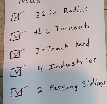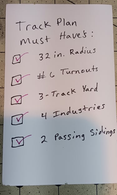 When I start a track plan, I usually have a prototype in mind that I'm trying to recreate in miniature. I draw out the space available, noting key dimensions, window and door locations, and any obstructions. Then I start a list of my "Wants-tos" and "Gots-tos". The Wants-tos are the things I want. Examples might be a minimum 32" radius curve, number 6 switches, 200' long main track, 3 passing sidings, 4 industrial switching areas, 18" deep benchwork, a 6-track classification yard, with 16' long body tracks, and a 20' long yard lead separate from the mainline.